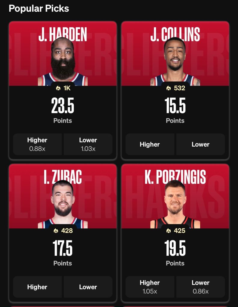 James Harden is by far the most appealing to the general public at time of writing. His points projection is currently at 23.5 points on the Underdog app. James Collins and Ivica Zubac are also getting love with Kawhi out and Beal’s status in doubt.