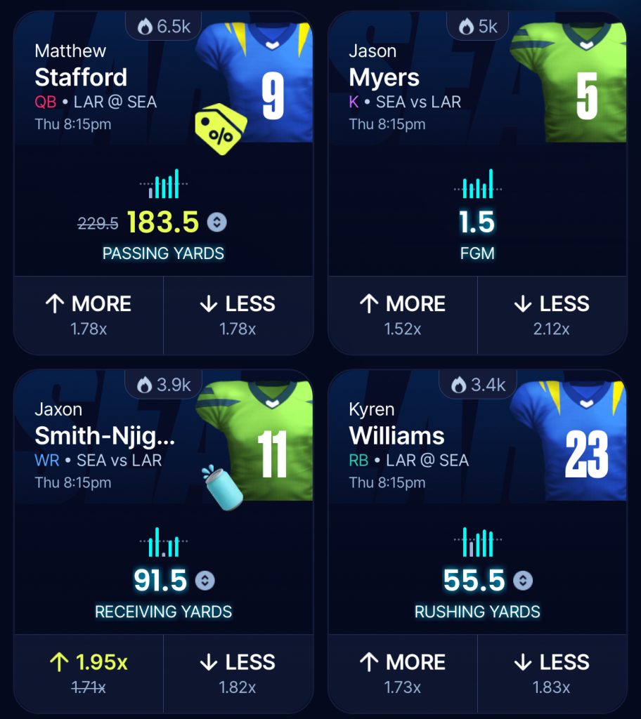 Take a glance at our favorite Rams vs Seahawks plays. This section features a combination of picks you can find on sites like Underdog and Sleeper! Check out some top TNF picks on Sleeper: