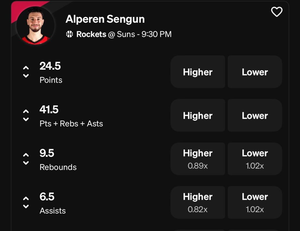 Along with KD, Sengun and Amen Thompson have been playing top-tier basketball. That duo should assume a lot of usage, and we also have interest in Reed Sheppard, who has been tremendous off the bench.